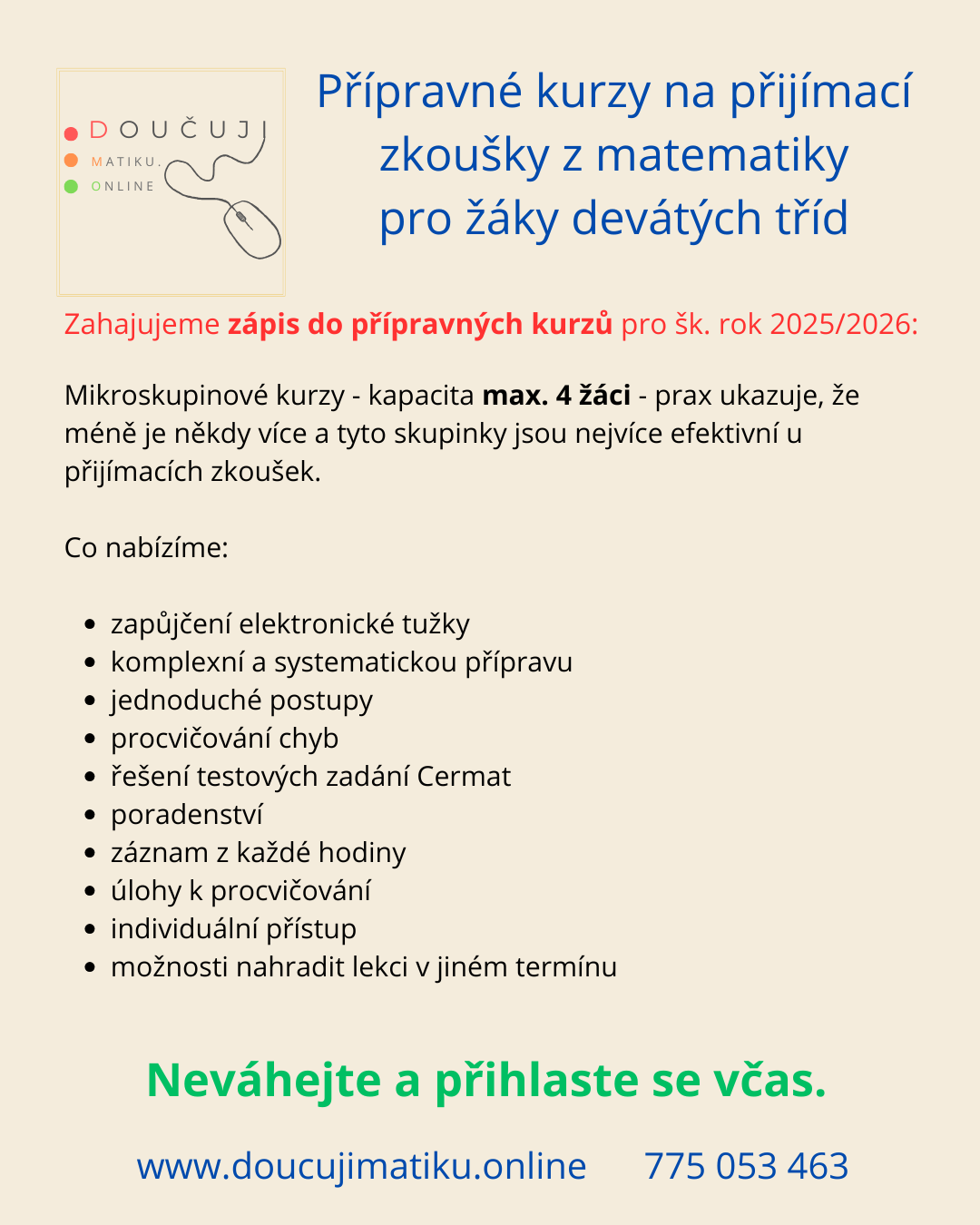 24 hodin intenzivní přípravy. Pravidelná, systematická příprava na přijímačky. Osvojení a upevnění vědomostí a dovedností dle Standardu pro základní vzdělávání, opakování učiva druhého stupně, dotažení nedostatků, řešení typových příkladů a zkušebních testů Cermat. Max. kapacita 4 studenti na kurzu.